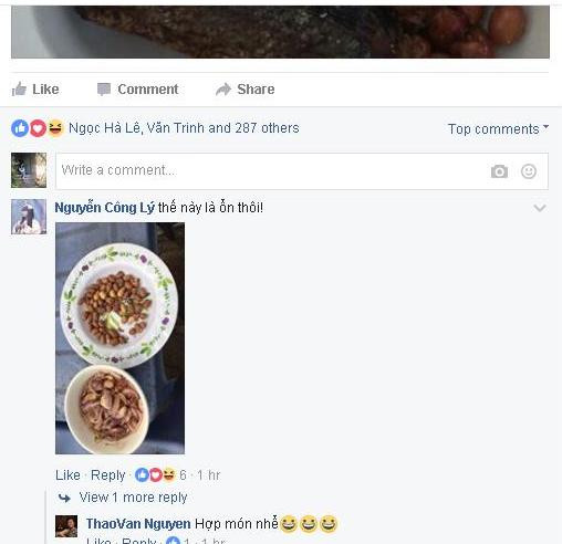 Ngay dưới bức ảnh và chia sẻ của MC Thảo Vân, chồng cũ của cô – nghệ sĩ Công Lý để lại bình luận không kém phần hài hước với bức ảnh chụp đĩa lạc rang và bát hành tím ngâm mắm. Chồng cũ của Thảo Vân không quên bình luận: “Thế này là ổn thôi”. Đáp lại, nữ MC tài năng bình luận về bữa ăn của Công Lý rằng: “Hợp món nhể”. Phần đối đáp của cả hai khiến nhiều người thích thú bởi dù không còn là vợ chồng nhưng Thảo Vân và Công Lý vẫn giữ được quan hệ bạn bè tốt và cách ứng xử lịch thiệp với nhau.