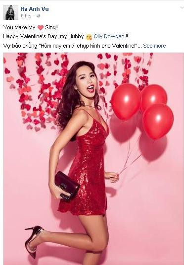 Siêu mẫu Hà Anh trên trang mạng xã hội cá nhân cũng bày tỏ tình yêu dành cho người bạn đời của mình. Chân dài chia sẻ, cô nói với chồng: “Hôm nay em đi chụp hình cho Valentine” và ông xã người nước ngoài của cô nhắn lại rằng “Anh hy vọng em không chụp với anh chàng nào đấy chứ!”.