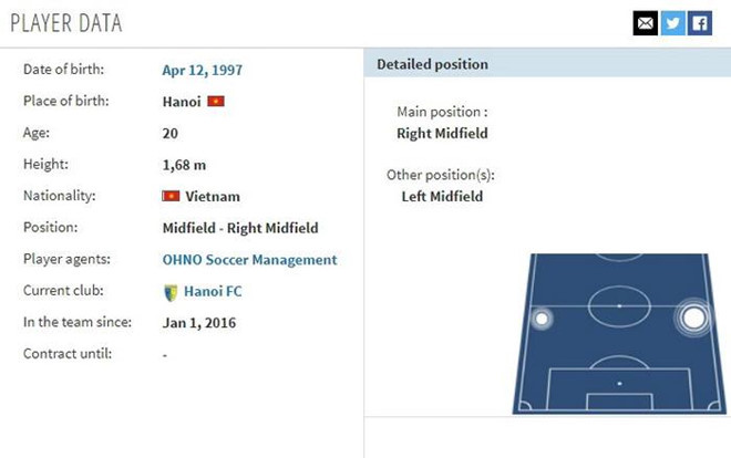 Hồ sơ của Quang Hải trên trang Transfermarkt có ghi đại diện là OHNO Soccer Management