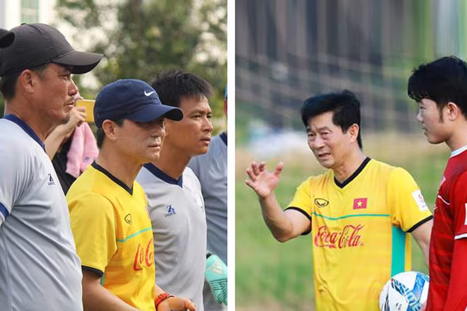 Ông Bae Ji-won (áo vàng) khi còn là trợ lý ĐT Việt Nam (ảnh phải) và nay là trợ lý cho CLB giải hạng nhì Bà Rịa Vũng Tàu.
