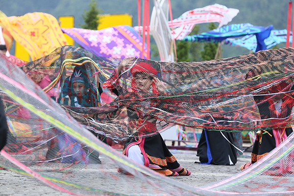 Những chiếc gùi đựng vải thổ cẩm được các chàng trai cô gái bản sắp xếp nghệ thuật thành bối cảnh phiên chợ tình. Vẫn những tấm vải thổ cẩm đó được kết thành bộ trang phục của cô dâu và chú rể người Dao đỏ. Và khán giả vô cùng kinh ngạc trước màn kết “Tòa sen chốn bồng lai”, khi 10 khung cửi của đồng bào dân tộc ở phần 1 – “Vũ điệu trên mây” được sắp đặt tạo thành một đài sen lớn, các diễn viên như những áng mây trắng hòa mình với thiên nhiên, bay quyện vào đài sen tạo nên một hình tượng rực rỡ, biểu đạt cho sự thành kính chiêm bái Đức Phật hiển linh.