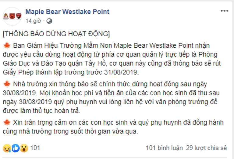 Ngày 22-8, thông báo từ Ban Giám hiệu trường Mầm non Maple Bear Westlake Point được công khai đến phụ huynh học sinh cho biết, trường này sẽ chính thức dừng hoạt động sau ngày 30/08/2019. Phụ huynh liên hệ với văn phòng trường để được làm thủ tục hoàn trả mọi khoản học phí và tiền ăn của học sinh đã thu sau ngày 30/08/2019.