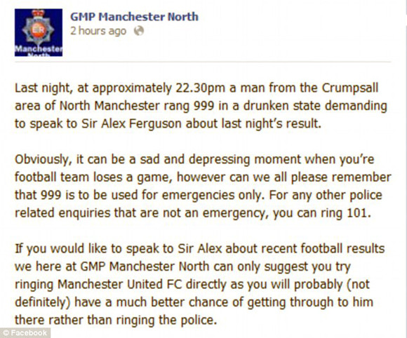 Thông báo chính thức trên trang Facebook của lực lượng cảnh sát thành phố Manchester cho hay: “Một người đàn ông ở khu Crumpsall, phía Bắc thành phố Manchester đã gọi điện tới cho chúng tôi để yêu cầu được nói chuyện với Sir Alex về kết quả của trận đấu đêm qua của M.U. Tôi biết đó là một kết quả đáng buồn đối với các cổ động viên M.U nhưng tất cả nên nhớ rằng chỉ nên gọi số 999 trong trường hợp khẩn cấp. Những ai có vấn đề cá nhân và không khẩn cấp thì nên gọi số 101. Nếu như các bạn muốn nói chuyện với Sir Alex thì nên gọi tới câu lạc bộ và biết đâu bạn sẽ được nói chuyện với ông ấy”.