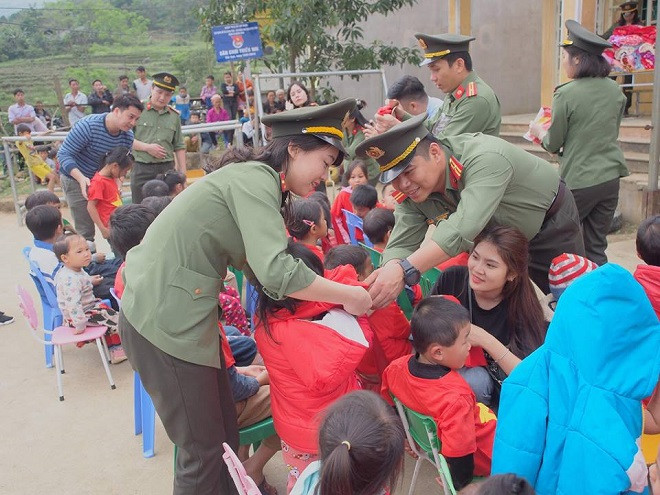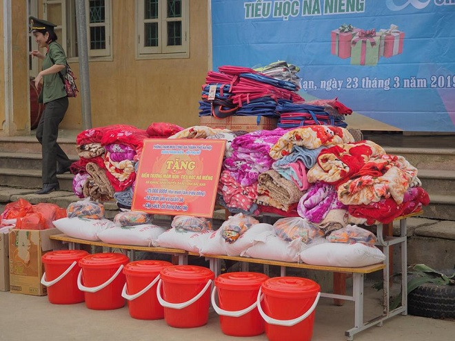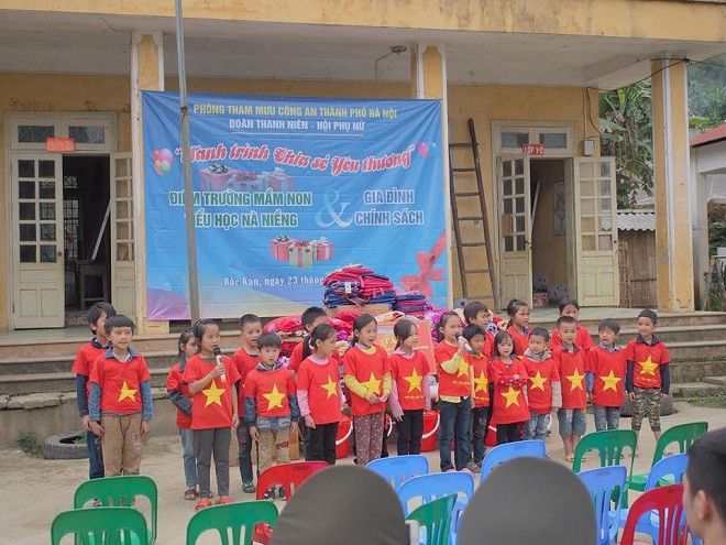 Tại điểm trường Nà Niềng, có 13 cháu mầm non và 21 học sinh tiểu học, hàng ngày các cháu nhỏ vẫn băng qua núi để tìm đến cái chữ… Phòng Tham mưu CATP Hà Nội đã tặng mỗi cháu 1 ba lô đi học, sách, vở, bút, chăn ấm, quần áo mới và tặng quà động viên tinh thần 4 thầy cô giáo tại điểm trường.