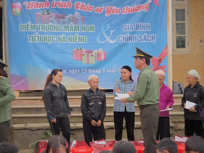 Đại úy Nguyễn Thị Thu Trang - Bí thư Đoàn phòng Tham mưu trao quà tặng các thầy cô giáo điểm trường Nà Niềng