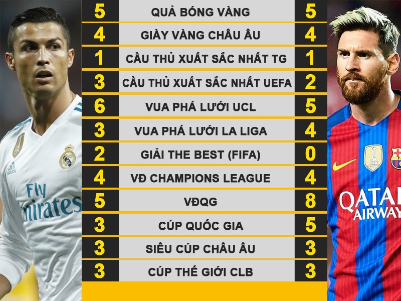 Thống kê về thành tích giữa hai siêu sao này cũng cho ra kết quả đáng kinh ngạc. Ngoài việc cùng 5 lần giành QBV, Ronaldo và Messi đều đã có 4 lần sở hữu Chiếc giày vàng châu Âu, 1 lần giành Cầu thủ xuất sắc nhất thế giới, 4 lần vô địch Champions League, 3 lần đoạt Siêu cúp châu Âu và 3 Cúp thế giới cùng với CLB của mình.