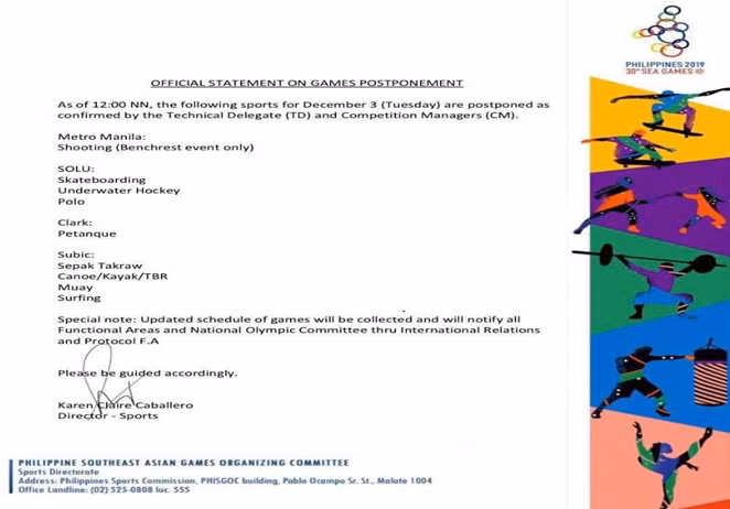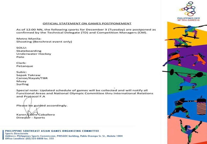 Theo thông báo phát đi lúc 12h hôm nay, BTC SEA Games thông báo dời lịch các môn thi gồm bắn súng, khúc gôn cầu dưới nước, bóng chuyền bãi biển, canoe/kayak, pencak silat, chèo chuyền/lướt ván buồm, lướt sóng, 5 môn phối hợp, 3 môn phối hợp.