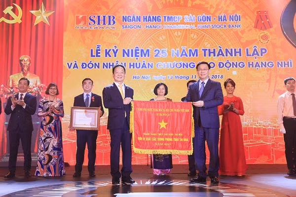 Ủy viên Bộ Chính trị, Phó Thủ tướng Chính phủ Vương Đình Huệ thay mặt Đảng và Nhà nước trao Huân chương Lao động Hạng Nhì và Cờ Thi đua của Chính phủ cho Ngân hàng SHB