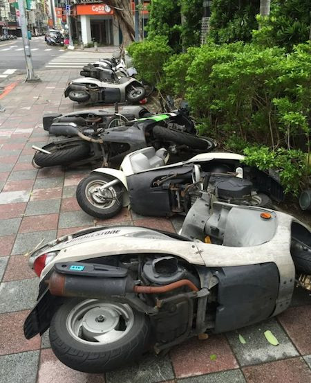 Xe máy đổ thành hàng khi cơn bão có sức gió lên tới 227 km/h quét qua Đài Loan