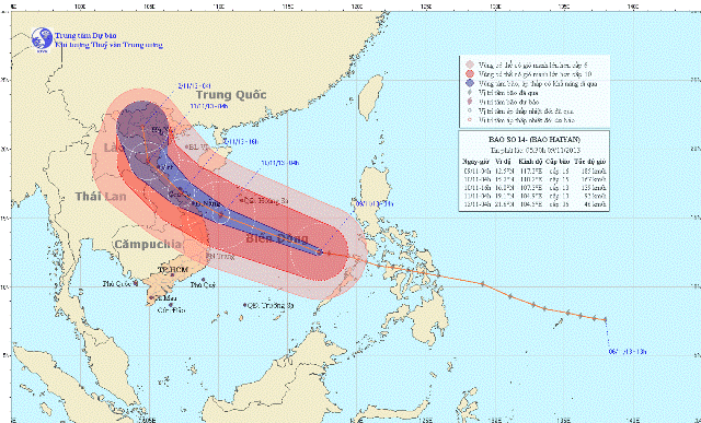 Trong ngày hôm nay, bão số 14 vẫn tiếp tục tăng tốc với tốc độ di chuyển từ 30-35km/h. Đến 4h sáng mai 11-11, vị trí tâm bão ở vào khoảng 15,2 độ Vĩ Bắc; 110,2 độ Kinh Đông, trên vùng biển các tỉnh Thừa Thiên Huế - Bình Định. Sức gió mạnh nhất vùng gần tâm bão mạnh cấp 14, cấp 15, giật cấp 16, cấp 17,