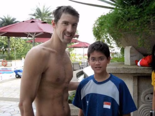 8 năm trước, Schooling khi đó mới là cậu bé 13 tuổi đã hạnh phúc khi được gặp thần tượng Michael Phelps, người khi đó đã nổi danh thế giới.