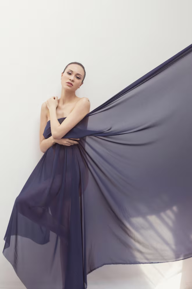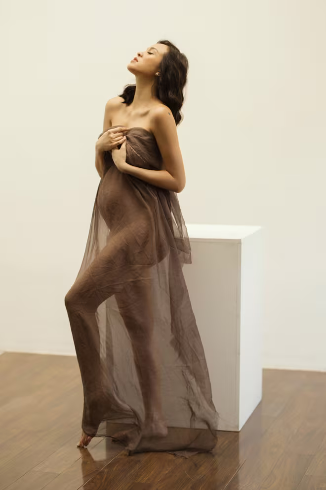 Trong bộ ảnh nude, Phương Mai che cơ thể bằng tấm lụa mỏng, để lộ bụng bầu ở những tháng cuối. Do chế độ ăn uống hợp lý cùng việc tập luyện yoga đều đặn, nữ MC vẫn có vóc dáng rất gọn gàng, chỉ có vòng hai ngày một tăng lên. Trước ống kính của nữ nhiếp ảnh gia 9X Rose Ng, bà bầu Phương Mai sexy hơn bao giờ hết. Cô tự nhận rằng, mình trở nên nữ tính hơn khi mang thai.