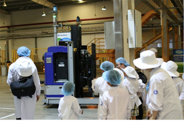 Qua sự giới thiệu của người dẫn đoàn là đại diện Nhà máy Vinamilk, phụ huynh và những vị khách “nhí” trầm trồ khi chứng kiến hệ thống robot LGV chuyển pallet thành phẩm đến khu vực kho thông minh, vận chuyển các cuộn bao bì và vật liệu bao gói đến các máy một cách tự động. Hệ thống này còn có thể tự sạc pin mà không cần sự can thiệp của con người.