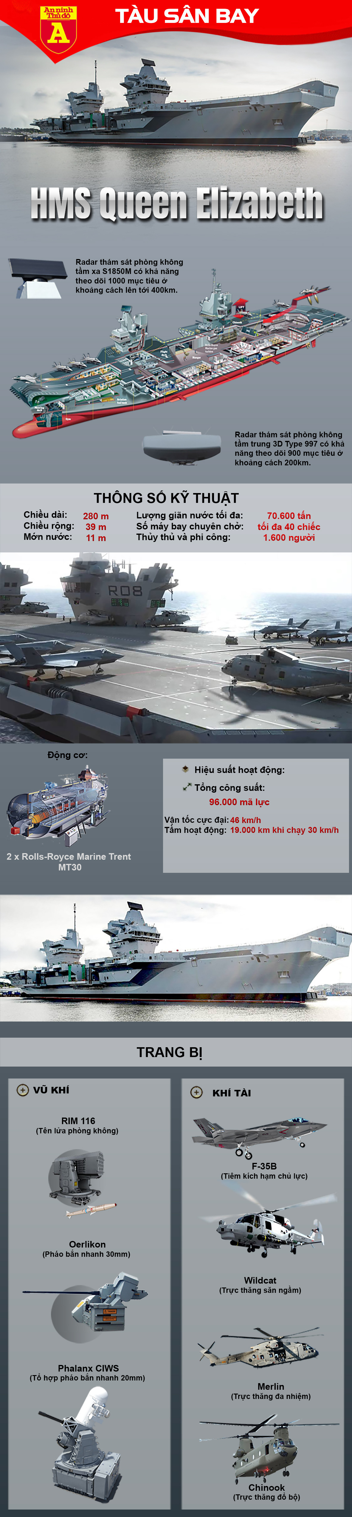 Tàu sân bay HMS Queen Elizabeth được bắt đầu khởi đóng tại xưởng đóng tàu Vabcock Marine Rosalie từ năm 2009, và được hoàn thành sau 5 năm. HMS Queen Elizabeth có lượng giãn nước đầy tải tới 72.000 tấn, nó to gấp ba lần tàu sân bay lớp Invincible, gấp hai lần tàu sân bay nguyên tử trang bị máy phóng Charles De Gaulle của Pháp, và chỉ thua 2 loại tàu sân bay lớp Nimitz và Gerald Ford của Mỹ.