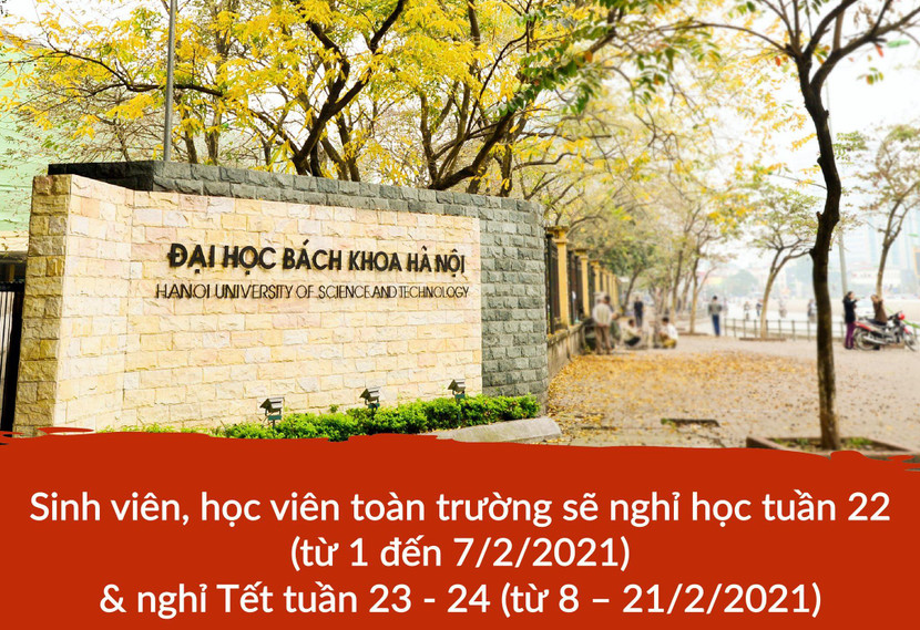 ĐH Bách khoa Hà Nội vừa chính thức thông báo cho toàn bộ sinh viên nghỉ học từ ngày 1/2 đến ngày 7/2. Từ ngày 8/2, sinh viên bắt đầu nghỉ Tết Nguyên đán như lịch đã thông báo trước đó.