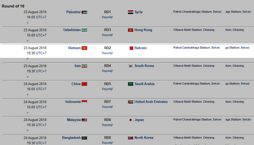 Lịch thi đấu vòng 1/8 môn bóng đá nam ASIAD