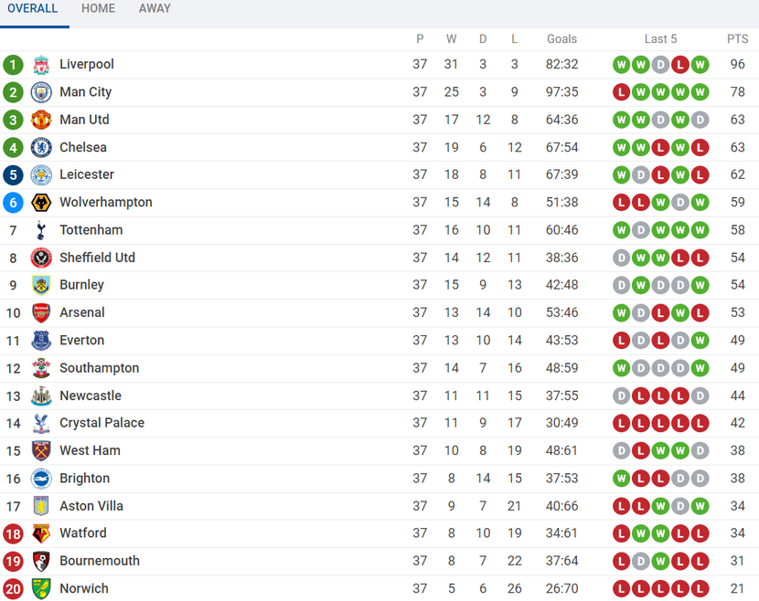 BXH Ngoại hạng Anh 2019/20 sau 37 vòng