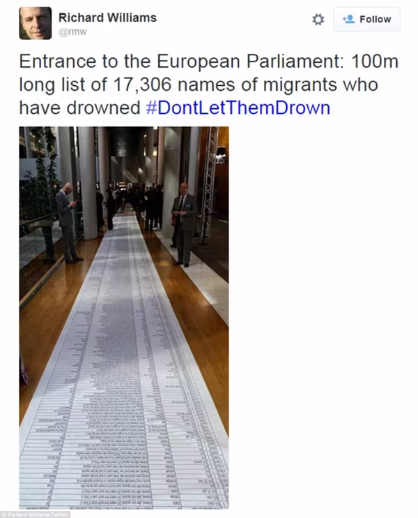 Một danh sách dài 100 mét chứa tên của 17.306 người di cư đã chết cố gắng tiếp cận châu Âu kể từ năm 1993 đã được dàn ra ở lối vào của Nghị viện châu Âu vào tháng 4-2015.