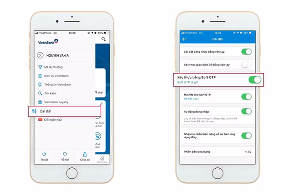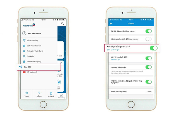 Khách hàng đăng ký Soft OTP trên VietinBank iPay Mobile (Mục cài đặt) để sử dụng giải pháp