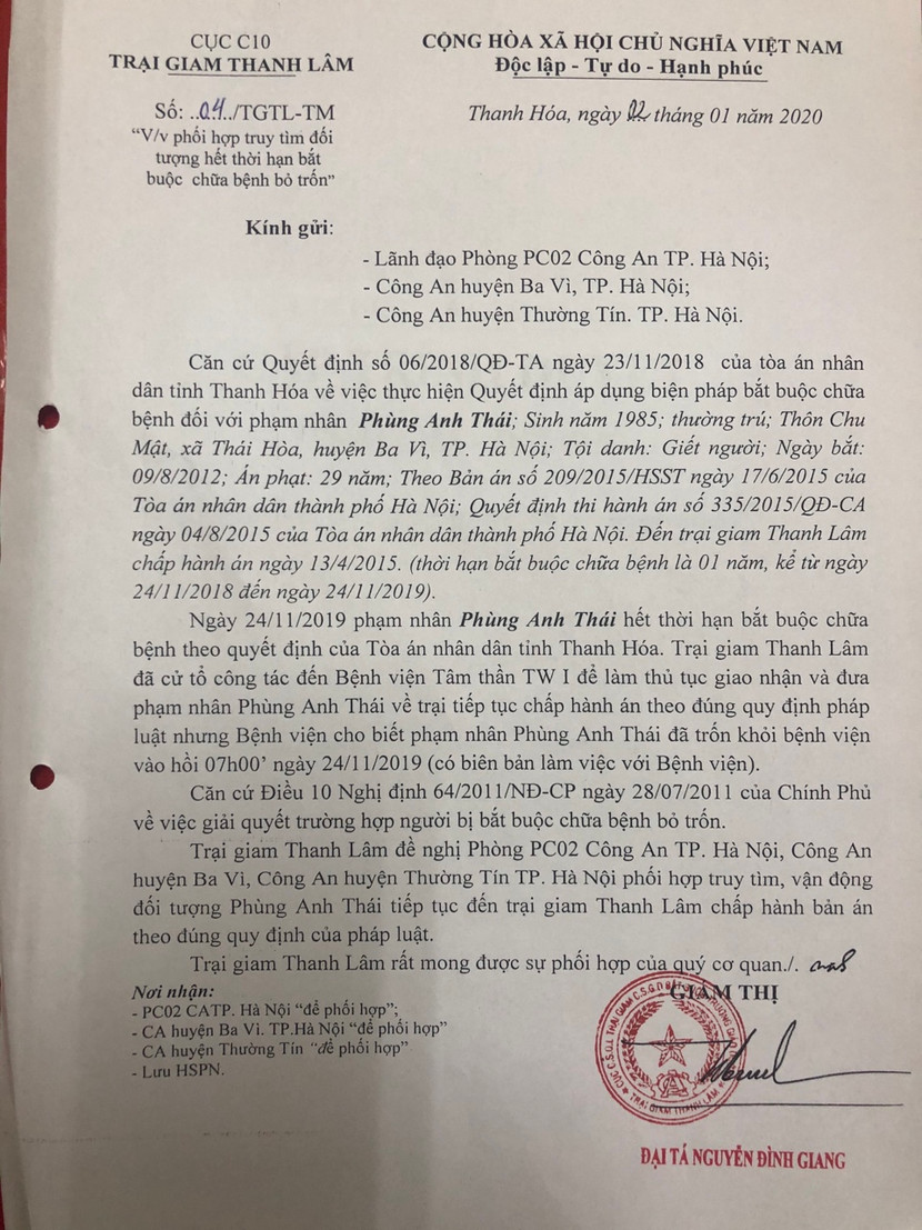 Theo hồ sơ, Phùng Anh Thái trước đó bị tuyên mức án 29 năm tù về tội giết người song được tạm hoãn để... giám định tâm thần. Ngày 24-11-2019, đúng thời điểm hết hạn chữa bệnh bắt buộc, Thái đã trốn khỏi Bệnh viện tâm thần trung ương I. Ngày 2-1-2020, Trại giam Thanh Lâm (nơi Phùng Anh Thái phải chấp hành bản án) đã phát thông báo gửi đến các đơn vị chức năng đề nghị phối hợp truy tìm, vận động Thái quay về thi hành án.