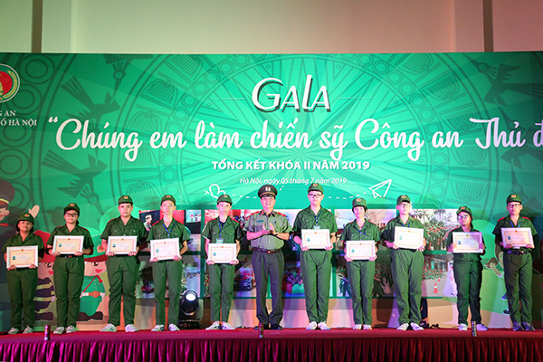 Thiếu tướng Đào Thanh Hải, Phó Bí thư Đảng ủy, Phó Giám đốc CATP Hà Nội trao giấy chứng nhận hoàn thành khóa học cho các chiến sỹ nhỏ tuổi