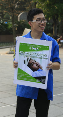 Những tấm poster tuyên truyền về chương trình gây quỹ từ thiện được các bạn trẻ chuyền tay nhau trên vỉa hè tại hồ Hoàn Kiếm