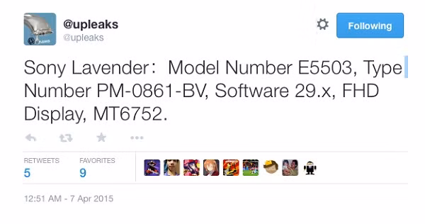 Sony Lavender sẽ có Android 5.0 được cài đặt ra khỏi hộp, và một phiên bản hai SIM sẽ có sẵn. Chiếc điện thoại này có một số mô hình của E5503 và dự kiến sẽ được giá như là một trung đến mô hình trên phạm vi.