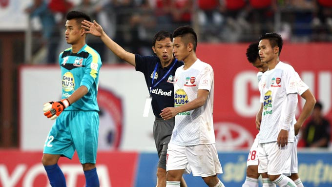 HLV Dương Minh Ninh (áo đen) thừa nhận các cầu thủ HAGL ít nhiều bị ảnh hưởng tâm lý sau tuyên bố bỏ giải của ông bầu Đoàn Nguyên Đức