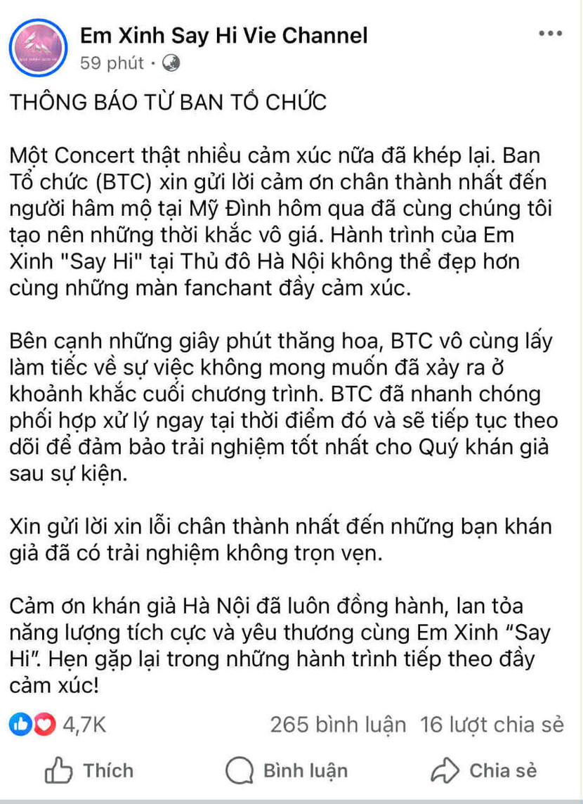 Bên cạnh những giây phút thăng hoa, BTC vô cùng lấy làm tiếc về sự việc không mong muốn đã xảy ra ở khoảnh khắc cuối chương trình. BTC đã nhanh chóng phối hợp xử lý ngay tại thời điểm đó và sẽ tiếp tục theo dõi để đảm bảo trải nghiệm tốt nhất cho Quý khán giả sau sự kiện. Xin gửi lời xin lỗi chân thành nhất đến những bạn khán giả đã có trải nghiệm không trọn vẹn. Cảm ơn khán giả Hà Nội đã luôn đồng hành, lan tỏa năng lượng tích cực và yêu thương cùng Em Xinh “Say Hi”. Hẹn gặp lại trong những hành trình tiếp theo đầy cảm xúc!"