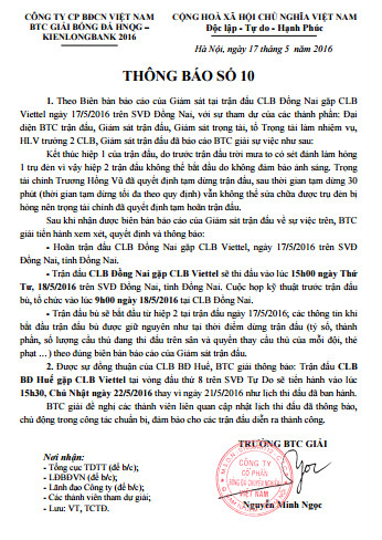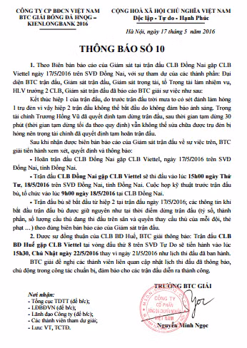 Ngay tối cùng ngày, Trưởng BTC giải Nguyễn Minh Ngọc đã ký Thông báo số 10, thông tin về sự cố nói trên, đồng thời cho biết: "Trận thi đấu lại sẽ thi đấu vào lúc 15h ngày 18-5 trên sân Đồng Nai, và được bắt đầu từ hiệp 2 tại trận đấu ngày 17-5.