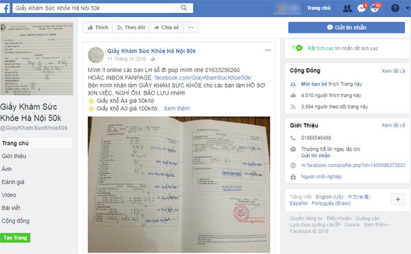 Rao bán công khai giấy khám sức khỏe giả trên mạng xã hội Facebook