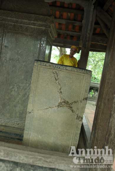 Từ trong đền còn vương nguyên mùi nhang bước qua bậu cửa ra ngoài, thấy lòng thanh thản hơn. Nhưng khi chân đặt đến nhà bia, chẳng thể có suy nghĩ khác ngoài việc xót xa cho Loa Thành lịch sử. Một tấm bia đá vỡ tan được ghép lại bằng xi măng chằng chịt. “Đó là tấm bia bị người dân ăn cắp về nung vôi. Nhưng bao lần cũng không chín được bia đá. Sau lần đó gia đình làm ăn bại hoại, khốn khó vô cùng. Đi xem thầy bảo gia đình lấy cắp của nơi thiêng nào đó một vật gì, nên gặp họa rồi họ mang đến trả lại…”- ông từ Nguyễn Văn An cho biết.