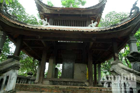Những tấm bia đá được đặt trang nghiêm trong nhà bia 4 mái cong vút. 4 bên có bậc tam cấp lên xuống, có đôi lân đá uy nghiêm nghếch đầu phục bên lối lên xuống. Ngoài tấm bia đá từng bị mất cắp, trong nhà bia còn có 3 tấm bia đá khác nằm trên lưng rùa hướng về ao rồng phía cổng Loa Thành. 3 tấm bia còn lại được cho là rất cổ, đến nay giới khảo cổ vẫn còn nhiều ý kiến trái chiều về lịch sử nên chưa có thống nhất chung về tấm bia đó của thời nào khắc tạc.