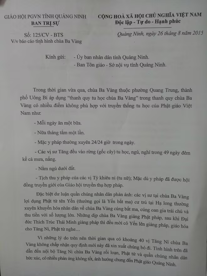 Theo đó, công văn cho biết, trong thời gian qua, chùa Ba Vàng thuộc phường Quang Trung, thành phố Uông Bí áp dụng “thanh quy tu học chùa Ba Vàng”, trong thanh quy chùa Ba Vàng có nhiều điểm không phù hợp với truyền thống tu học của Phật giáo Việt Nam như: Mỗi ngày ăn một bữa, nửa tháng tắm một lần, mặc y pháp thường xuyên 24/24 giờ trong ngày. Các vị sư tăng đều vào rừng (gốc cây) tu học, ngủ, nghỉ trong 49 ngày đêm kể cả mưa nắng. Nằm ngủ dưới đất.