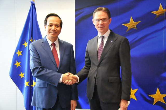 Bộ trưởng Bộ LĐ-TB&XH Đào Ngọc Dung và ông Jyrki Katainen, Phó Chủ tịch Ủy ban châu Âu phụ trách về vấn đề việc làm Ảnh: TTXVN