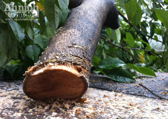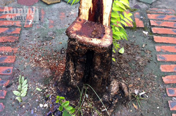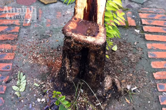 Theo quan sát của phóng viên, tại hiện trường, mùn cưa rơi vãi đầy gốc cây. Bọn trộm đã khuân đi phần thân to nhất, để lại một đoạn gốc (cao chừng 40cm, đường kính 18cm, trong đó phần lõi đỏ chỉ khoảng 10cm); cách đó không xa là tán lá lòa xòa bị vứt trên vỉa hè.
