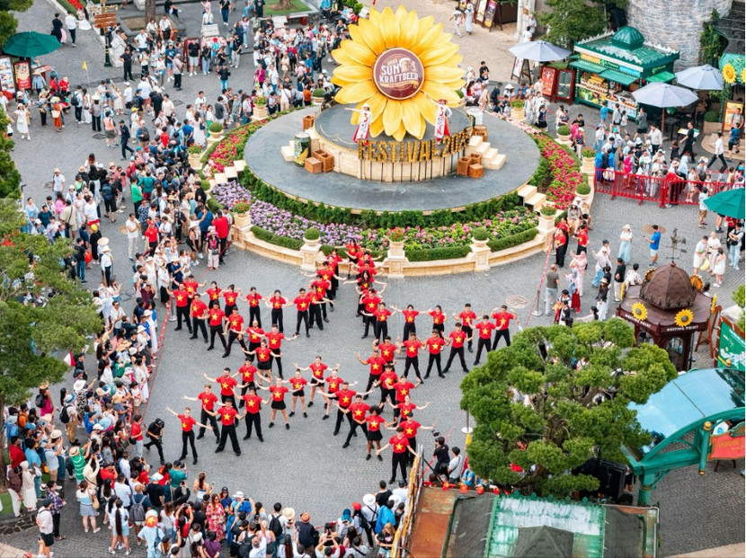 Trong không gian châu Âu đậm chất cổ tích, Sun World Ba Na Hills đón hàng vạn du khách bằng những màn carnival tưng bừng, vườn hoa khoe sắc và chuỗi biểu diễn nghệ thuật đặc sắc. Lâu đài cổ, Quảng trường Nhật Thực, đặc biệt là Cầu Vàng rợp cờ đỏ sao vàng trở thành điểm hẹn cho hàng nghìn bức ảnh kỷ niệm ngày lễ.