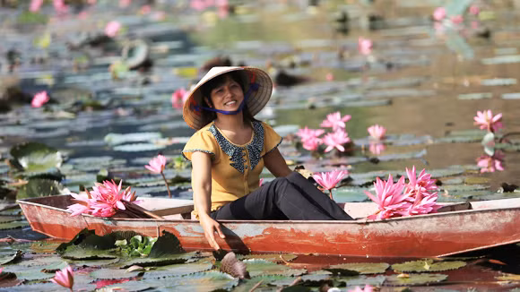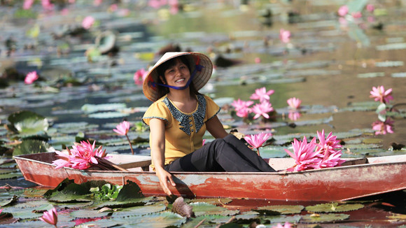 Một bóng thuyền nhẹ trôi trên dòng suối, không gian tĩnh lặng bởi người chèo thuyền chỉ dùng tay gạt nước, vớt những bông súng đầu tiên mới nở vẫn còn e ấp dưới ánh ban mai để tô điểm thêm sắc màu cho cuộc sống.
