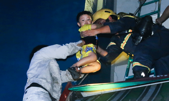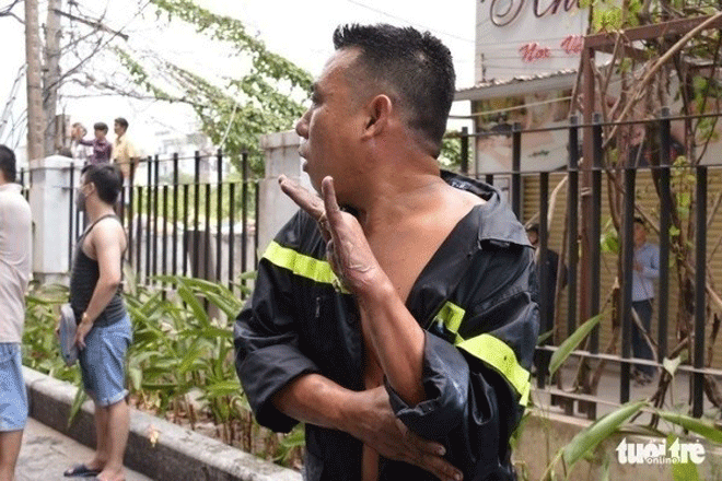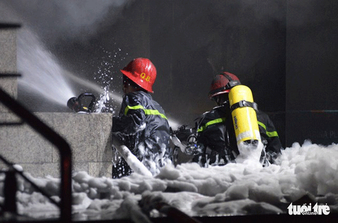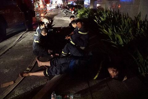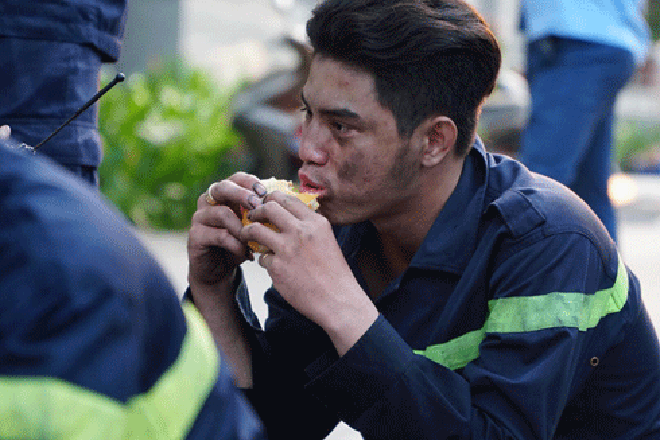 ANTD.VN -Sáng 23-3, nhiều chiến sĩ Cảnh sát PCCC TP.HCM mệt lả người, khuôn mặt lấm lem, thất thần, ngồi tựa vào gốc cây, xe chữa cháy để nghỉ ngơi, gặm bánh mì chống đói sau một đêm dốc sức lực cứu hàng trăm người trong tòa nhà chung cư cao cấp Carina Plaza bị cháy. Có chiến sĩ bị bỏng rộp cả bàn tay...