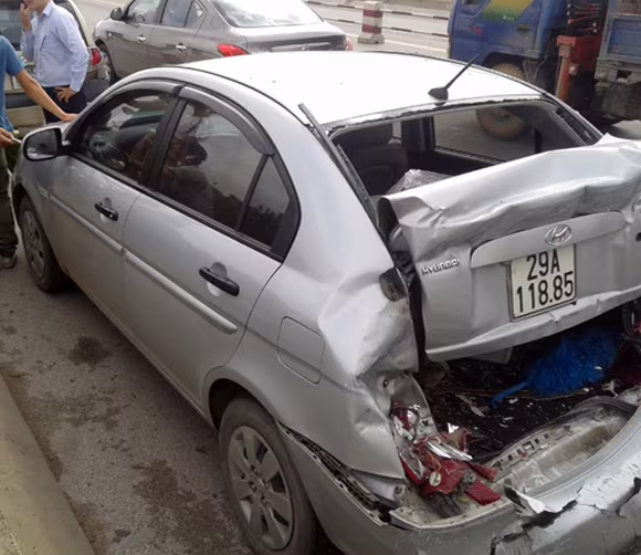 Khoảng 8h30 sáng nay, chiếc xe ôtô con màu đồng mang BKS 89K – 9373 chạy trên cầu Thanh Trì hướng Hà Nội đi Bắc Ninh, thì đột ngột tránh một xe ôtô khác vượt đường. Do xe phanh đột ngột khiến ôtô Hundai 4 chỗ mang BKS 29A – 118.85 chạy cùng chiều phía phải, lao tới tông vào đuôi gây hư hỏng nhẹ. Chưa dừng lại ở đó, một ôtô tải chở hàng mang BKS 29C – 088.42 chạy với tốc độ nhanh đã tông thẳng vào đuôi xe ôtô màu trắng khiến chiếc xe này bị hư hỏng nặng phần đuôi, kính xe phía sau vỡ nát.