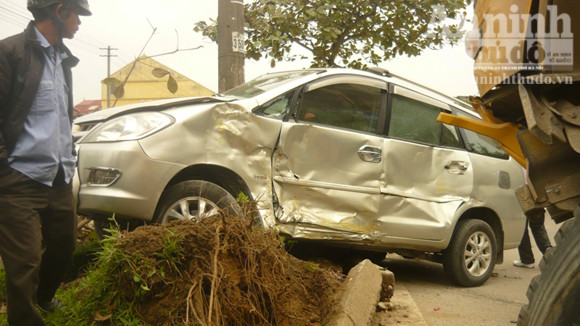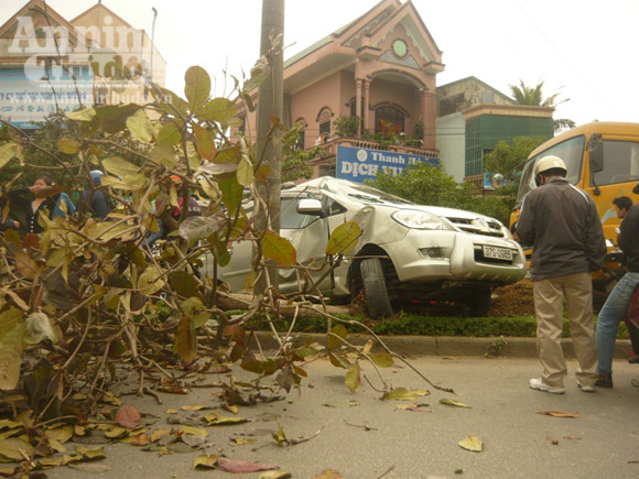 Đúng lúc này, chiếc ô tô tải mang BKS 37C – 04357 (chưa rõ danh tính tài xế) cũng từ phía sau đi lên đâm vào đuôi chiếc xe Innova khiến tài xế mất lái, lao xe ủi bay gần chục mét dải phân cách giữa đường. Chưa chịu dừng lại ở đó, chiếc xe này tiếp tục đâm và húc đổ cây bàng rồi quay ngang 180 độ mới chịu yên vị. Lúc này trên xe Innova có 5 người ngồi nhưng rất may không có ai bị thương nặng.