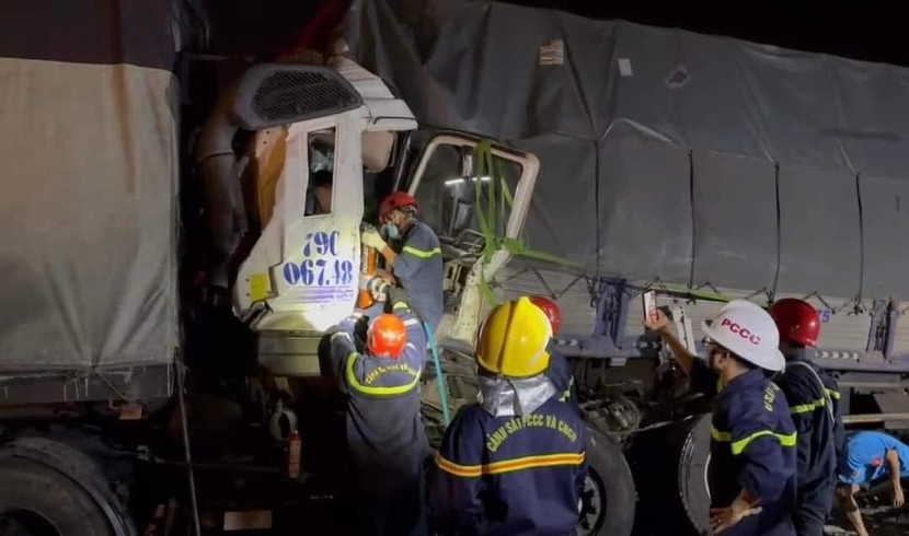 Lúc này, xe đầu kéo biển số 79C-06748/79R-00557 do Nguyễn Ngọc Ý (sinh năm 1983) điều khiển, phụ xe Nguyễn Kim Toàn (sinh năm 1995, ở Diên Khánh, Khánh Hòa) lưu thông cùng chiều phía sau không kịp xử lý đã tông vào xe tải 77C-06075.