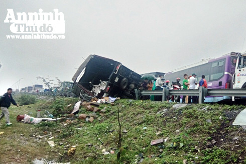 Tại hiện trường, chiếc xe tải bị lật nghiêng bên đường, hư hỏng nặng; ô tô khách và xe tải đi sau cũng bị nát bét phần đầu.