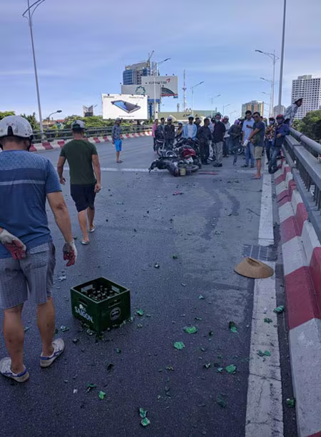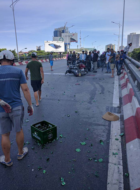 Tại hiện trường vụ tai nạn, phần đầu xe ô tô bị hư hỏng nặng. Nhiều xe máy nằm trên đường cũng trong tình trạng hỏng hóc. Trên khắp mặt cầu vương vãi những mảnh chai bia rất nguy hiểm cho những người tham gia giao thông qua đây.