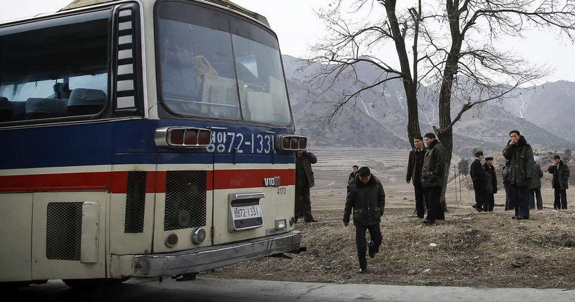 Xe buýt chở người dân Triều Tiên đi du lịch, dừng ở bên đường cao tốc để nghỉ ngơi tại quận Koksan ở tỉnh Hwanghae