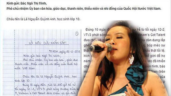 Câu chuyện mẹ của thí sinh Quỳnh Anh (15 tuổi) phản ứng gay gắt sau khi em bị loại khỏi cuộc thi Tìm kiếm tài năng Vietnam’s Got Talent sau khoảng 2 tuần ầm ĩ tưởng chừng đã lắng xuống. Thế rồi bất ngờ trên trang web của trường Quốc tế châu Á Thái Bình Dương APC, nơi Quỳnh Anh học, và cũng là nơi bà Nguyễn Thị Ngọ, mẹ của Quỳnh Anh làm Chủ tịch hội đồng quản trị, đăng tải một thư kêu cứu khẩn cấp gửi tới bà Ngô Thị Minh, Phó Chủ nhiệm Ủy ban văn hóa, giáo dục, thanh niên, thiếu niên và nhi đồng của Quốc hội Việt Nam.