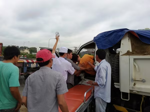 Cú tông mạnh khiến đầu xe tải bẹp dúm, biến dạng hoàn toàn. Kính chắn gió bể vụn, tài xế kẹt cứng trong cabin, la hét kêu cứu. Người dân xung quanh nhanh chóng dùng xà beng nậy cabin để đưa tài xế ra ngoài để đưa đi cấp cứu trong tình trạng nguy kịch.