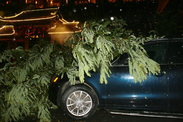 Trên đường Hạ Long (TP.Hạ Long), rất nhiều cây xanh gãy đổ. Đặc biệt, trước cửa nhà hàng Cổ Ngư, một cây xanh đổ đè lên xe ôtô hiệu Audi. Sau khoảng nửa tiếng ngớt mưa, đến gần nửa đêm trời lại đang mưa to. TP Hạ Long vẫn chưa cấp điện trở lại.