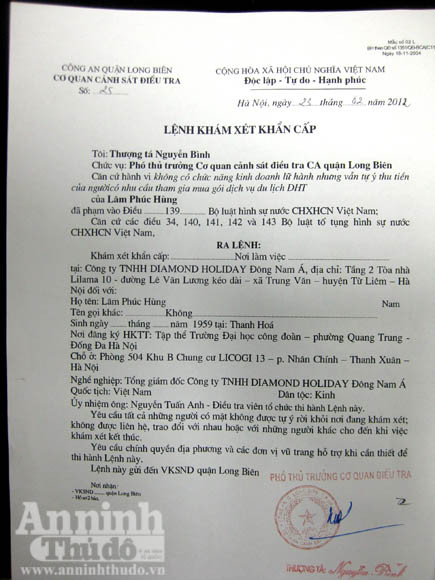 Tối 24-2, Viện KSND quận Long Biên, TP Hà Nội đã phê chuẩn lệnh tạm giam 4 tháng đối với ông Lâm Phúc Hùng (SN 1959), Tổng giám đốc Công ty TNHH Diamond Holiday Đông Nam Á về để điều tra về hành vi lừa đảo chiếm đoạt tài sản.