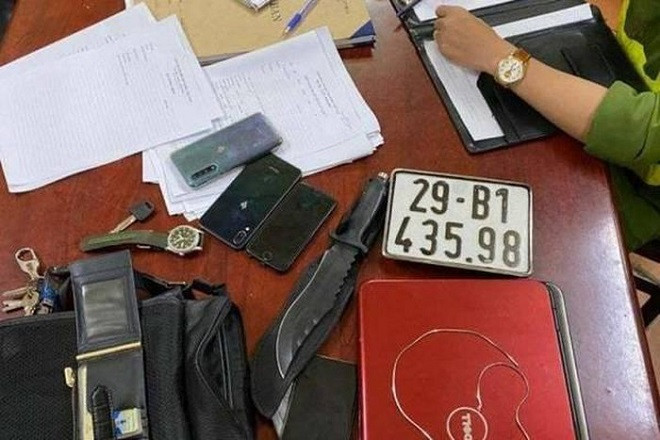 Lực lượng Công an thu 1 xe máy Piaggio màu đỏ không biển số (biển số 29B1 - 435.98 được tháo ra để trong cốp xe), 1 túi xách đựng máy tính Dell, 4 chiếc điện thoại di động và dao găm màu đen dài 25cm.